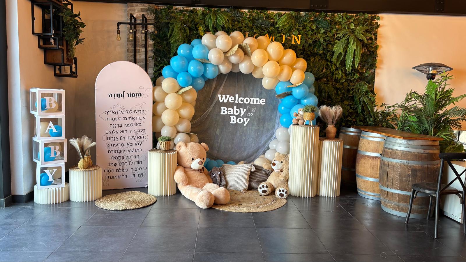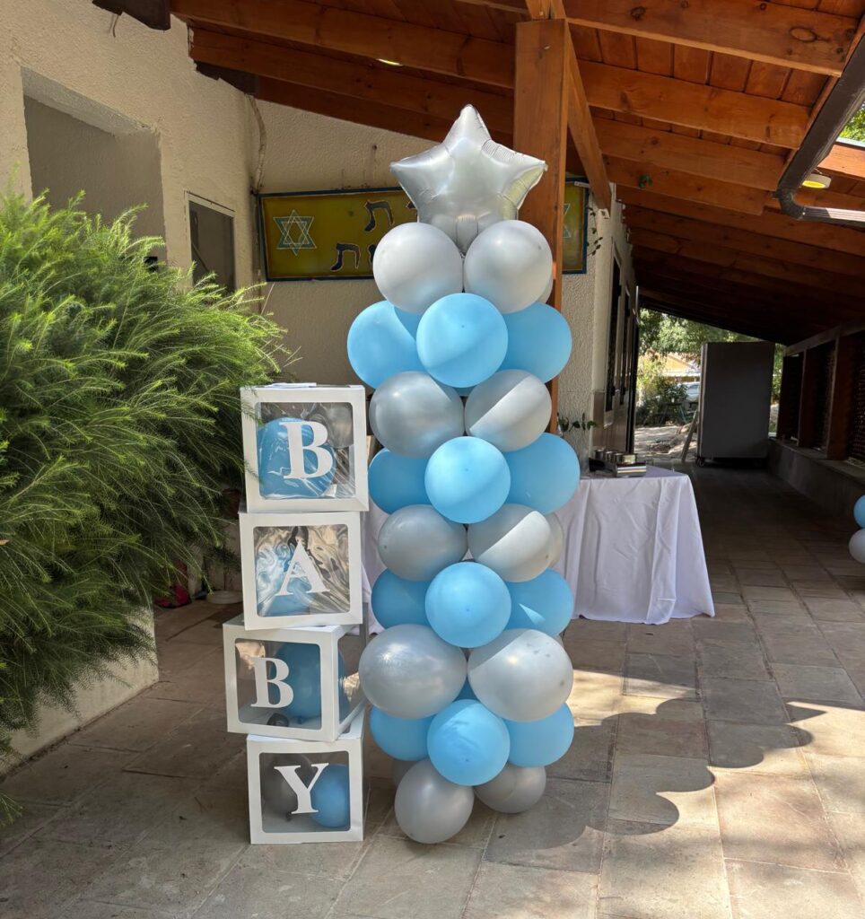 עיצוב קיר בלונים לברית עם כיתוב שתבחרו ואביזרים נוספים שמתאימים לאירוע